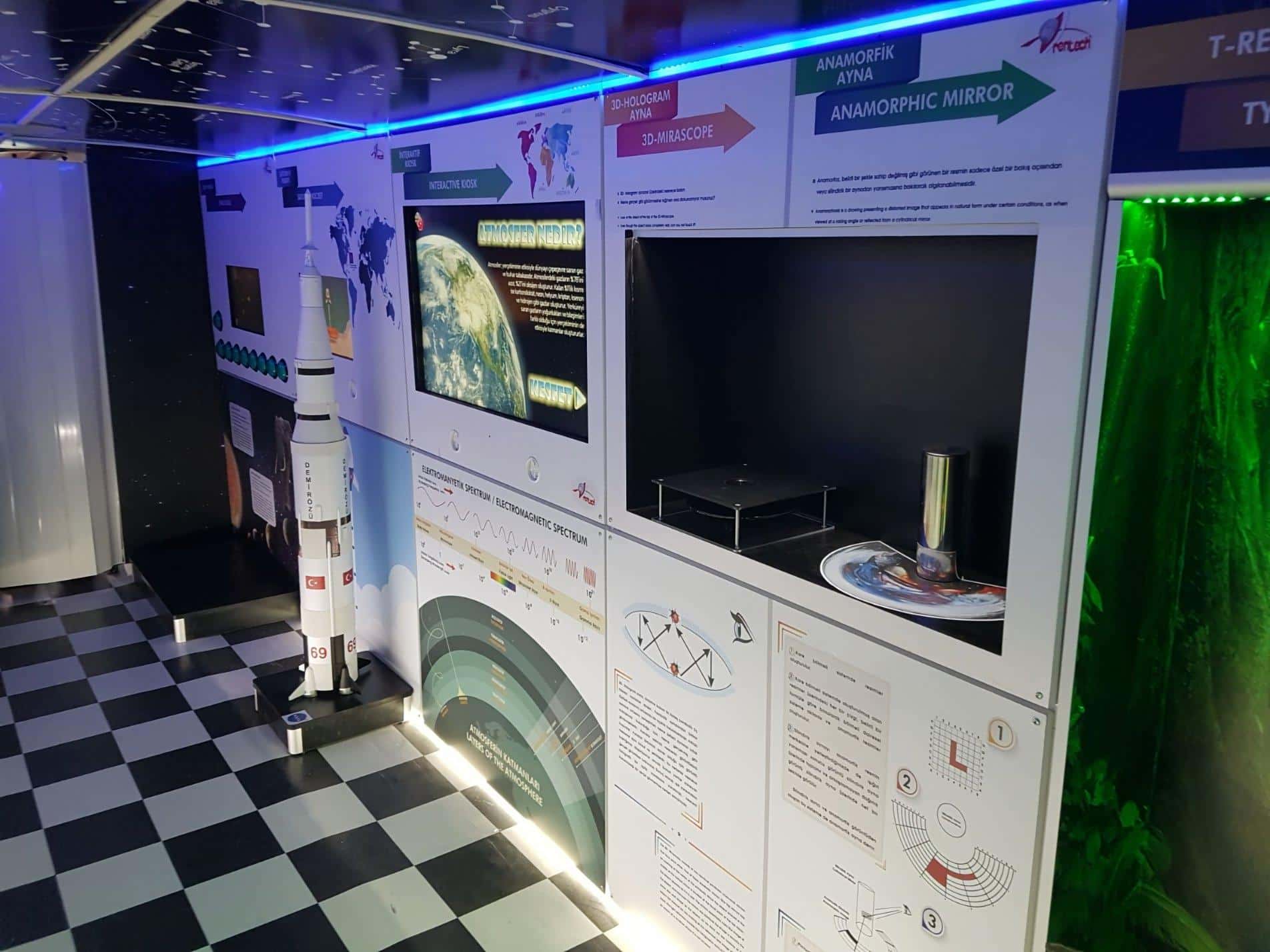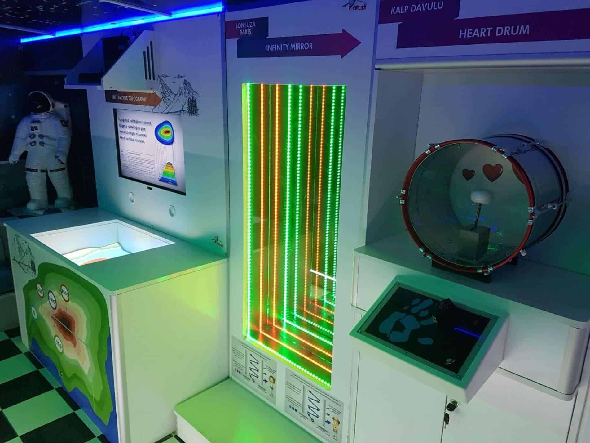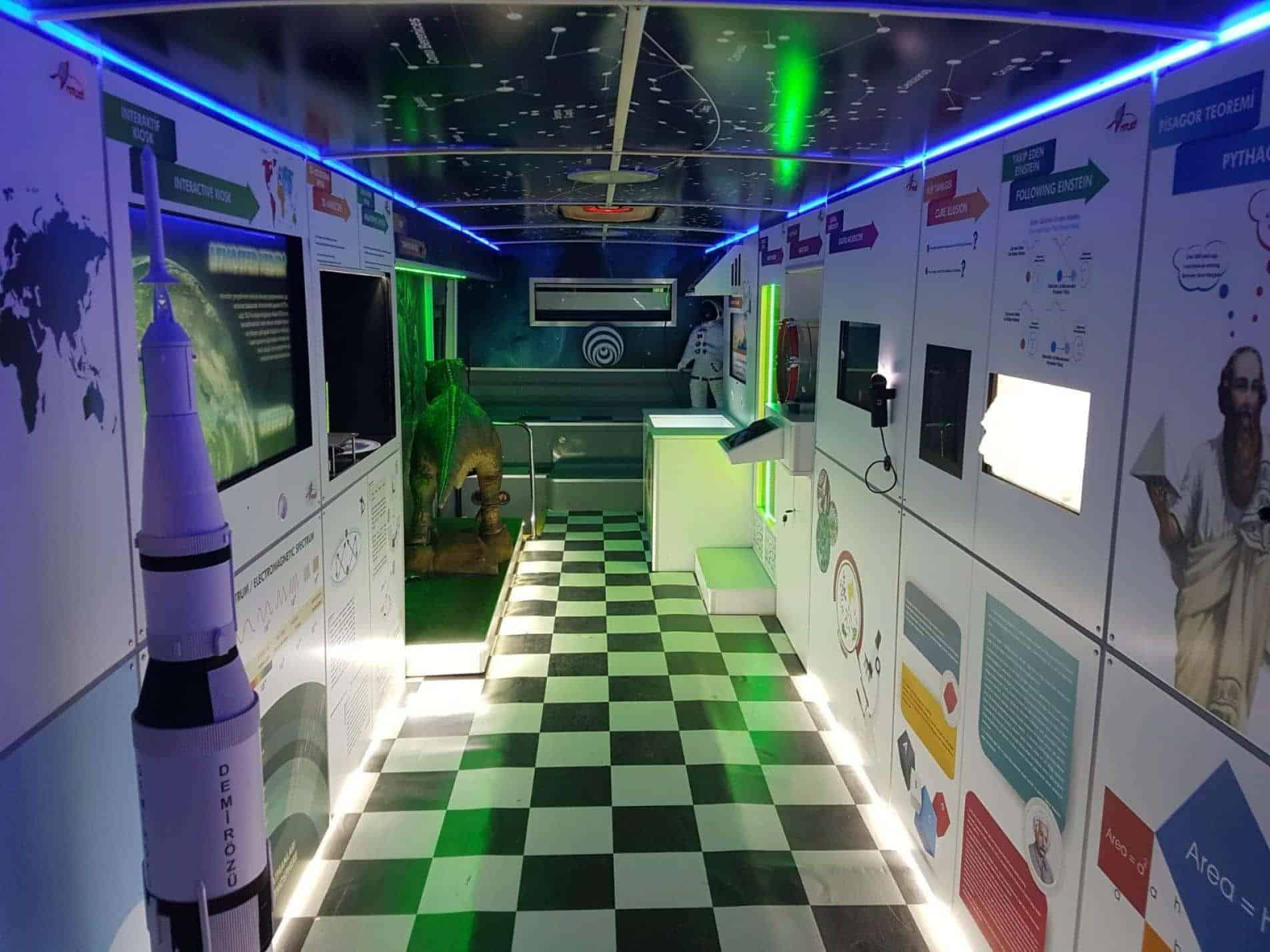 The Science Bus, the main component of the Mobile Science Center project, includes scientific experiment kits prepared for various disciplines such as Mathematics, Physics, Biology, Astronomy, and Geography. Some of these experiment kits are installed inside the bus, while others are set up externally as separate stands. In addition, a mobile space tent serving as a third stand allows visitors to watch different educational films.